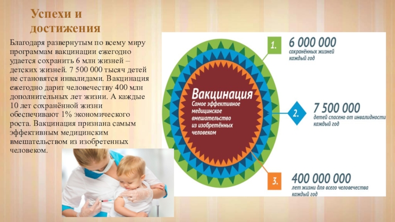 Успехи и достиженияБлагодаря развернутым по всему миру программам вакцинации ежегодно удается сохранить 6 млн жизней – детских