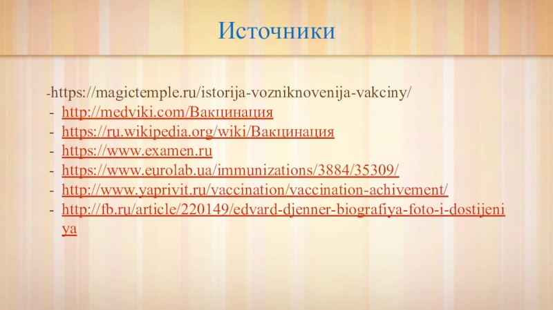 -https://magictemple.ru/istorija-vozniknovenija-vakciny/http://medviki.com/Вакцинация https://ru.wikipedia.org/wiki/Вакцинация https://www.examen.ru https://www.eurolab.ua/immunizations/3884/35309/ http://www.yaprivit.ru/vaccination/vaccination-achivement/ http://fb.ru/article/220149/edvard-djenner-biografiya-foto-i-dostijeniya Источники