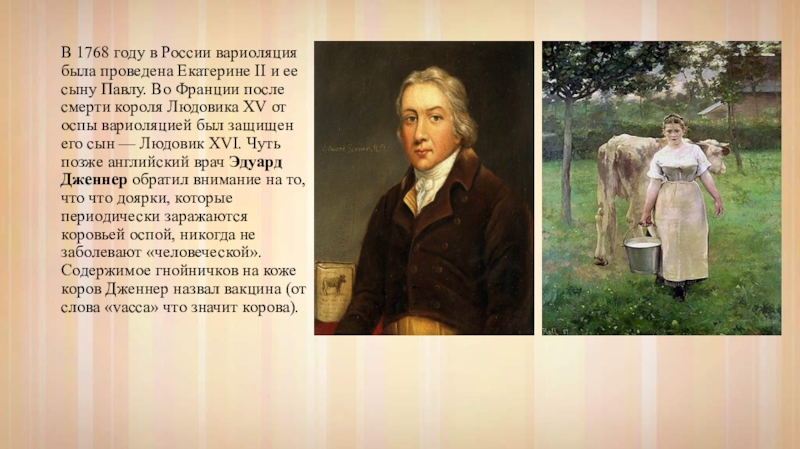 ее сыну Павлу. Во Франции после смерти короля Людовика ХV от оспы вариоляцией был защищен его сын — Людовик ХVI. Чуть позже английский врач Эдуард Дженнер обратил внимание на то, что что доярки, которые периодически заражаются коровьей оспой, никогда не заболевают «человеческой». Содержимое гнойничков на коже коров Дженнер назвал вакцина (от слова «vacca» что значит корова).