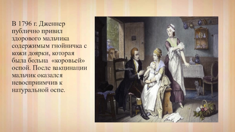 В 1796 г. Дженнер публично привил здорового мальчика содержимым гнойничка с кожи доярки, которая была больна «коровьей»