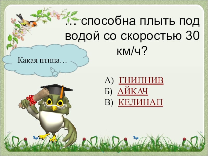 Какая птица…… способна плыть под водой со скоростью 30 км/ч?А) ГНИПНИВБ) АЙКАЧВ) КЕЛИНАП