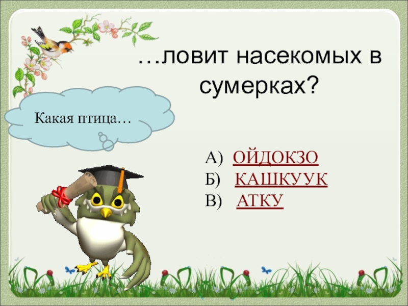 Какая птица……ловит насекомых в сумерках?А) ОЙДОКЗОБ)  КАШКУУКВ)  АТКУ