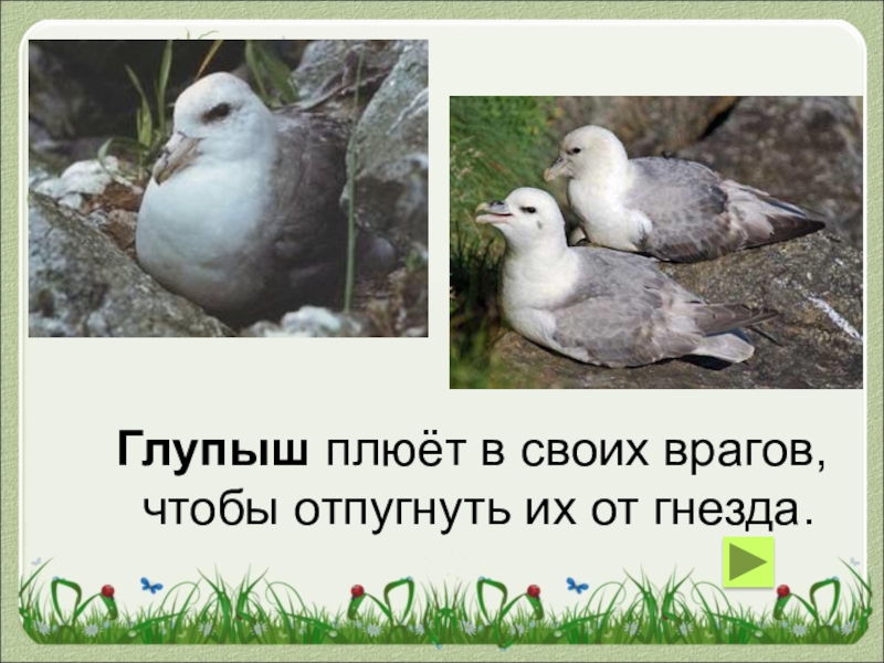 Глупыш плюёт в своих врагов, чтобы отпугнуть их от гнезда.