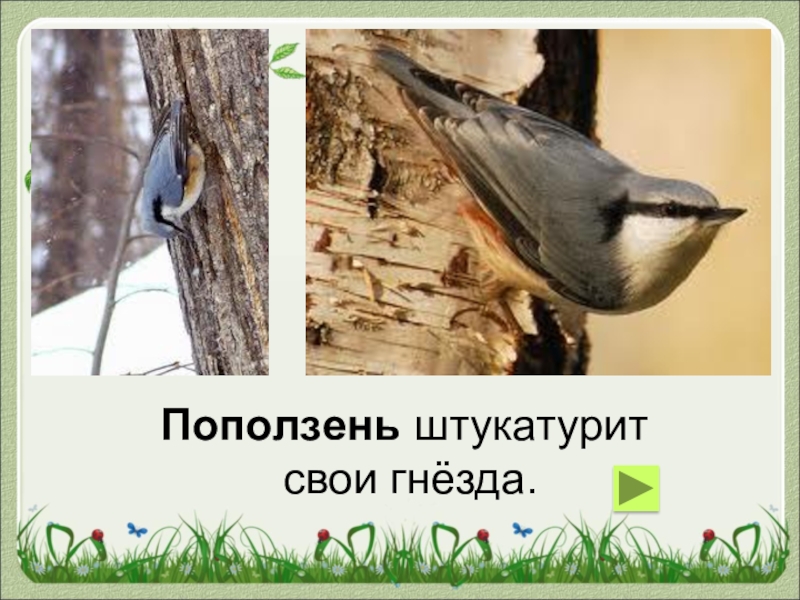 Поползень штукатурит свои гнёзда.