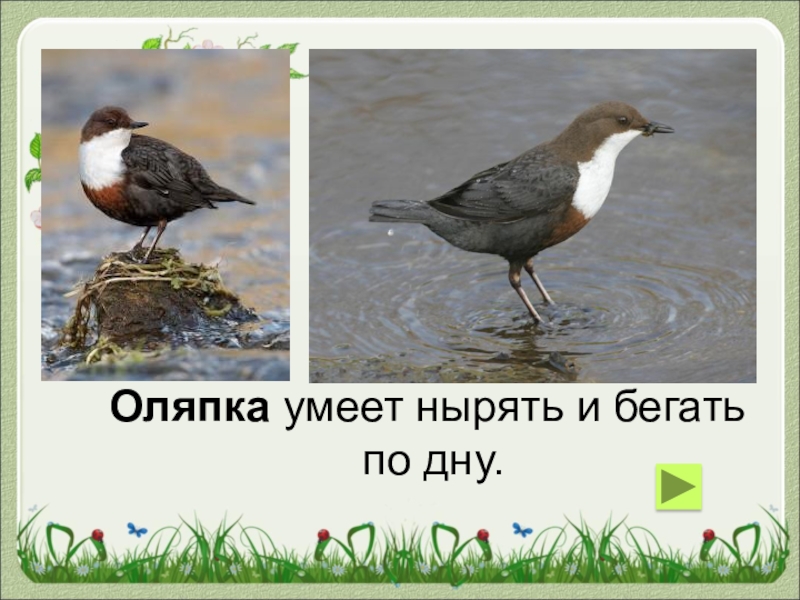 Слайд 27Оляпка умеет нырять и бегать
