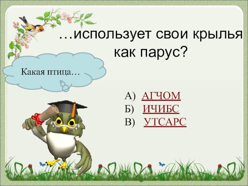Какая птица……использует свои крылья как парус?А) АГЧОМБ)  ИЧИБСВ)  УТСАРС