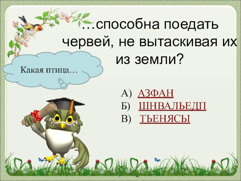 Какая птица……способна поедать червей, не вытаскивая их из земли?А) АЗФАНБ)  ШНВАЛЬЕДПВ)  ТЬЕНЯСЫ