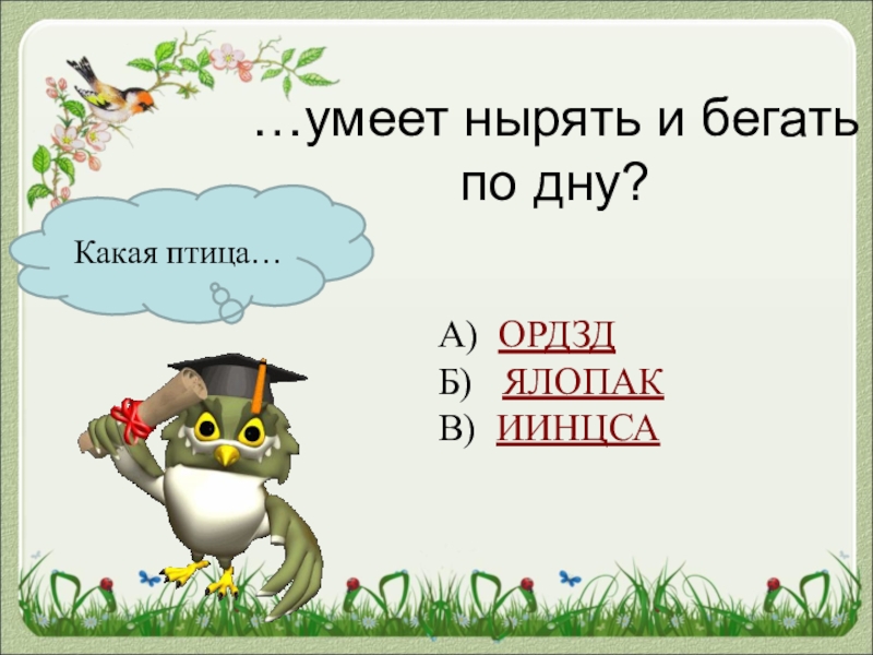 Какая птица……умеет нырять и бегать по дну?А) ОРДЗДБ)  ЯЛОПАКВ) ИИНЦСА