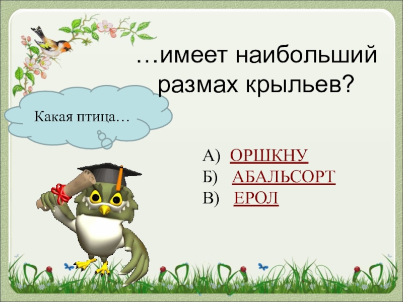 Какая птица……имеет наибольший размах крыльев?А) ОРШКНУБ)  АБАЛЬСОРТВ)  ЕРОЛ
