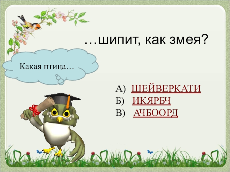 Какая птица……шипит, как змея?А) ШЕЙВЕРКАТИБ)  ИКЯРБЧВ)  АЧБООРД