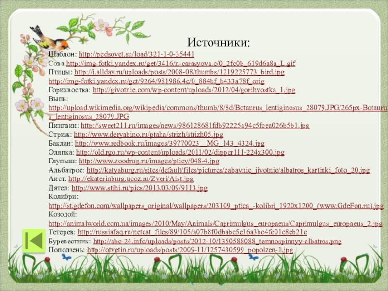 Источники:Шаблон: http://pedsovet.su/load/321-1-0-35441Сова:http://img-fotki.yandex.ru/get/3416/n-carasyova.c/0_2fc0b_619d6a8a_L.gifПтицы: http://i.allday.ru/uploads/posts/2008-08/thumbs/1219225773_bird.jpghttp://img-fotki.yandex.ru/get/9264/981986.4c/0_884bf_b433a78f_origГорихвостка: http://givotnie.com/wp-content/uploads/2012/04/gorihvostka_1.jpgВыпь: http://upload.wikimedia.org/wikipedia/commons/thumb/8/8d/Botaurus_lentiginosus_28079.JPG/265px-Botaurus_lentiginosus_28079.JPGПингвин: http://sweet211.ru/images/news/986128681fdb92225a94c5fcea026b5b1.jpgСтриж: http://www.deryabino.ru/ptaha/strizh/strizh05.jpgБаклан: http://www.redbook.ru/images/39770023__MG_143_4324.jpgОляпка: http://old.rgo.ru/wp-content/uploads/2011/02/dipper111-224x300.jpgГлупыш: http://www.zoodrug.ru/images/pticy/048-4.jpgАльбатрос: http://katyaburg.ru/sites/default/files/pictures/zabavnie_jivotnie/albatros_kartinki_foto_20.jpgАист: http://ekaterinburg.ucoz.ru/Zveri/Aist.jpgДятел: http://www.stihi.ru/pics/2013/03/09/9113.jpgКолибри: http://st.gdefon.com/wallpapers_original/wallpapers/203109_ptica_-kolibri_1920x1200_(www.GdeFon.ru).jpgКозодой: http://animalworld.com.ua/images/2010/May/Animals/Caprimulgus_europaeus/Caprimulgus_europaeus_2.jpgТетерев: http://russiafaq.ru/netcat_files/89/105/a07b8f0dbabc5e16a3bc4fc01c8eb21cБуревестник: http://abc-24.info/uploads/posts/2012-10/1350588088_temnospinnyy-albatros.pngПоползень:
