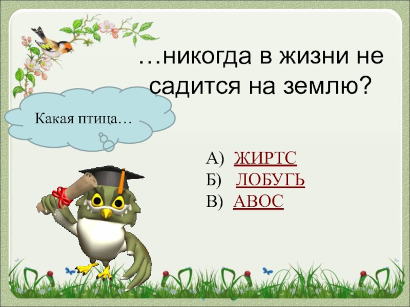 Какая птица……никогда в жизни не садится на землю?А) ЖИРТСБ)  ЛОБУГЬВ) АВОС