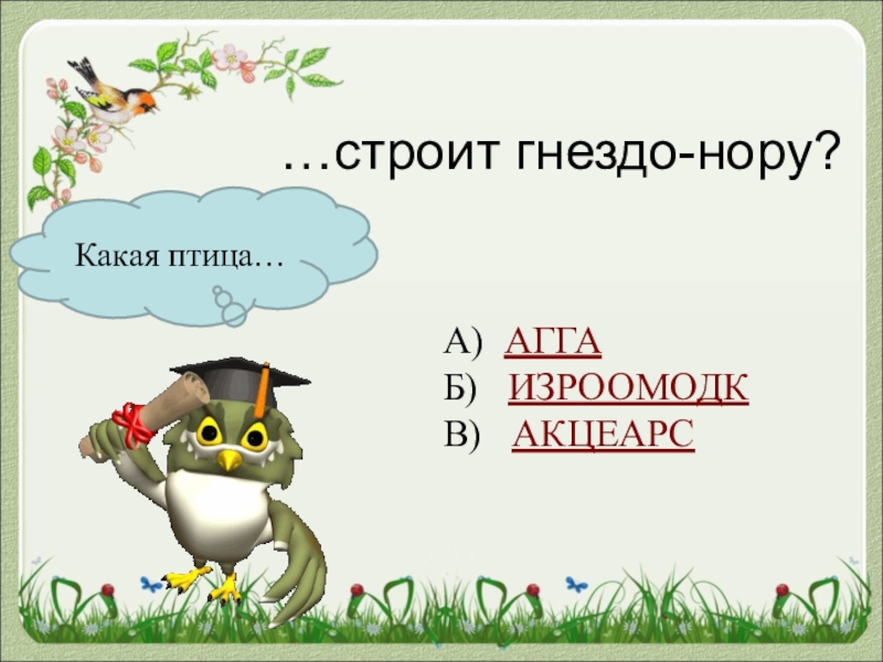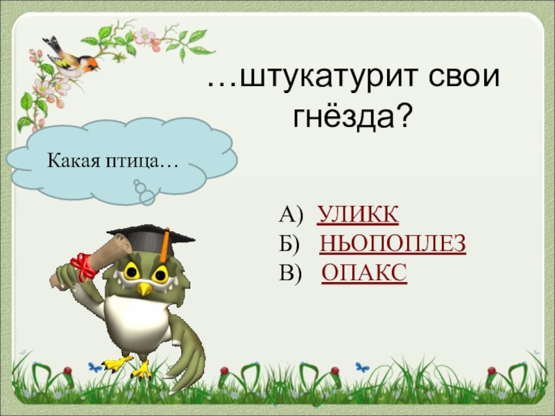 Какая птица……штукатурит свои гнёзда?А) УЛИККБ)  НЬОПОПЛЕЗВ)  ОПАКС
