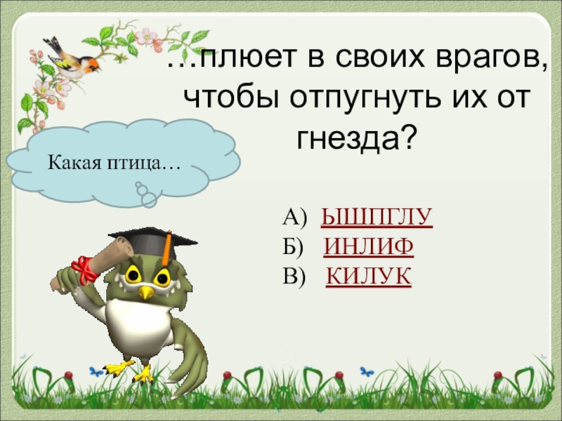 Какая птица……плюет в своих врагов, чтобы отпугнуть их от гнезда?А) ЫШПГЛУБ)  ИНЛИФВ)  КИЛУК