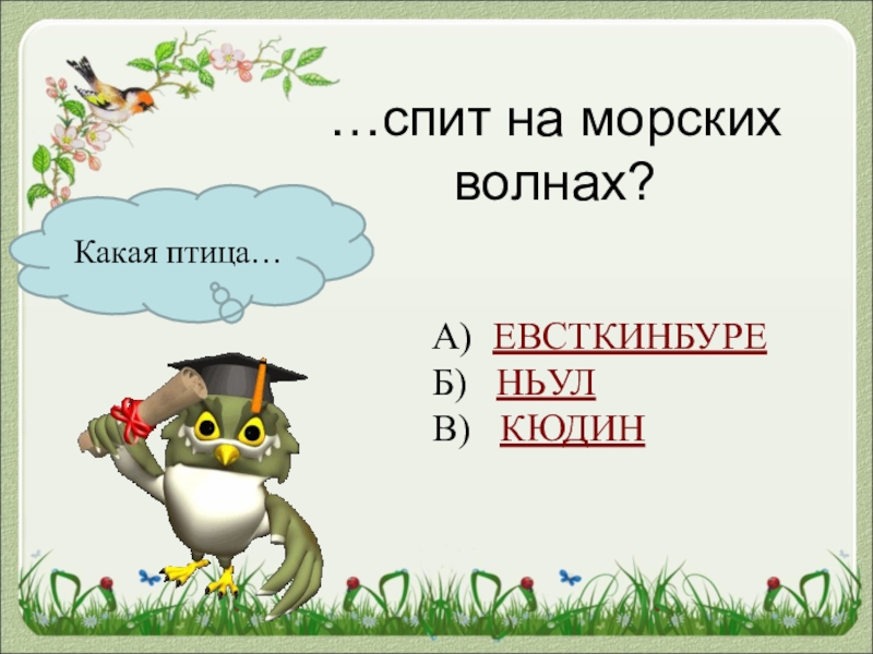 Какая птица……спит на морских волнах?А) ЕВСТКИНБУРЕБ)  НЬУЛВ)  КЮДИН