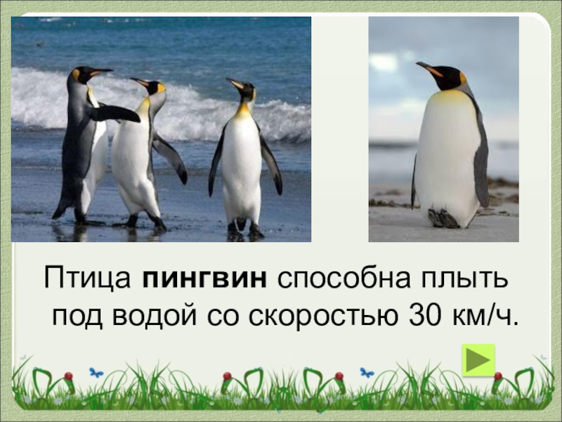 Птица пингвин способна плыть под водой со скоростью 30 км/ч.