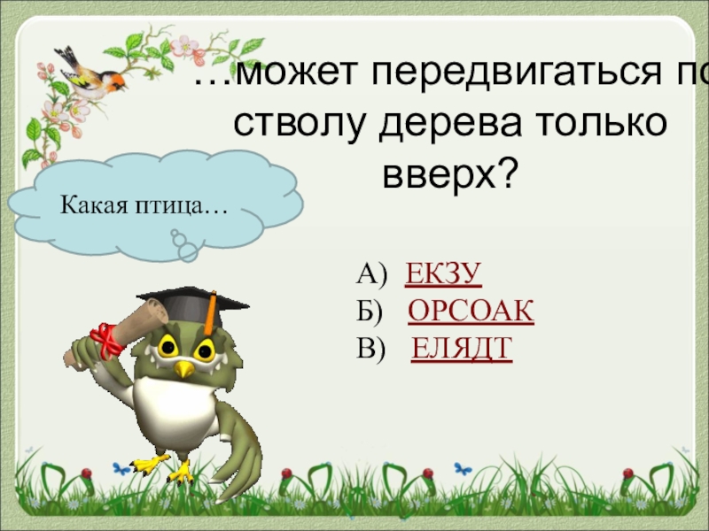 Какая птица……может передвигаться по стволу дерева только вверх?А) ЕКЗУБ)  ОРСОАКВ)  ЕЛЯДТ