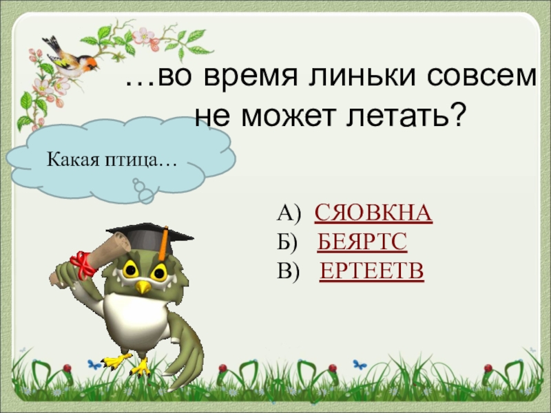 Какая птица……во время линьки совсем не может летать?А) СЯОВКНАБ)  БЕЯРТСВ)  ЕРТЕЕТВ