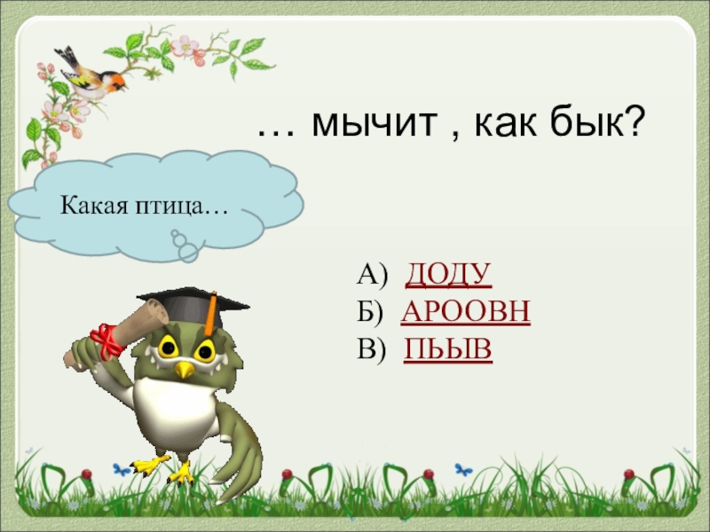Какая птица…… мычит , как бык?А) ДОДУБ) АРООВНВ) ПЬЫВ
