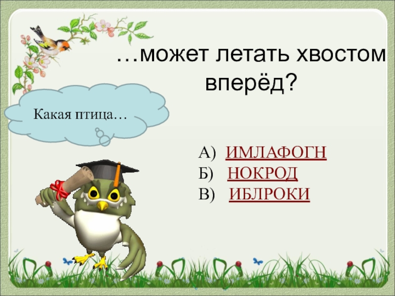Какая птица……может летать хвостом вперёд?А) ИМЛАФОГНБ)  НОКРОДВ)  ИБЛРОКИ
