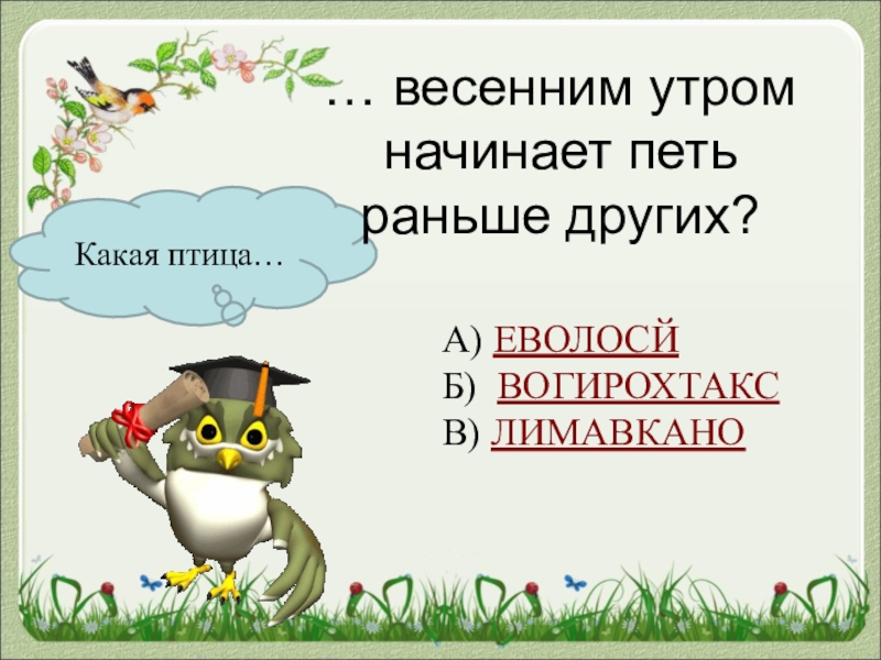 Какая птица…… весенним утром  начинает петь  раньше других?А) ЕВОЛОСЙБ) ВОГИРОХТАКСВ) ЛИМАВКАНО