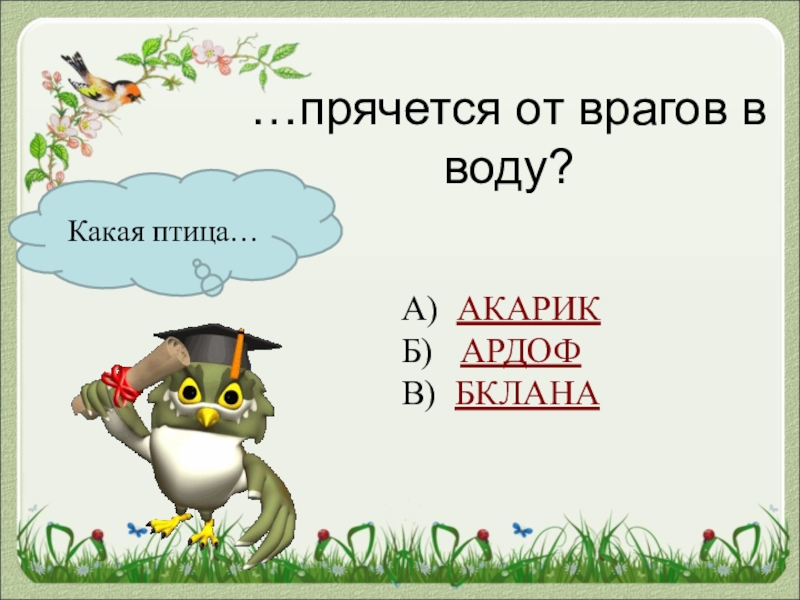 Какая птица……прячется от врагов в воду?А) АКАРИКБ)  АРДОФВ) БКЛАНА