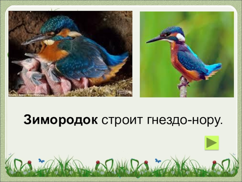 Слайд 38Зимородок строит гнездо-нору.