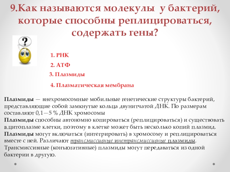 Плазмиды — внехромосомные мобильные генетические структуры бактерий, представляющие собой замкнутые кольца двунитчатой ДНК. По размерам составляют 0,1—5 % ДНК хромосомы
