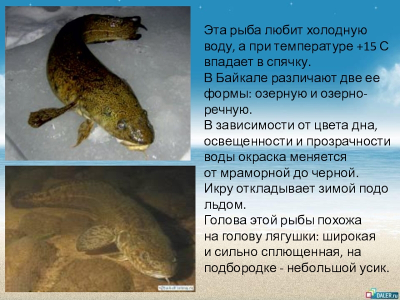 Слайд 13Самая прожорливая хищная рыба Байкала. Хорошо маскируется, выжидая добычу.