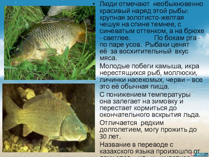 Слайд 7Люди отмечают необыкновенно красивый наряд этой рыбы: крупная золотисто-желтая чешуя на