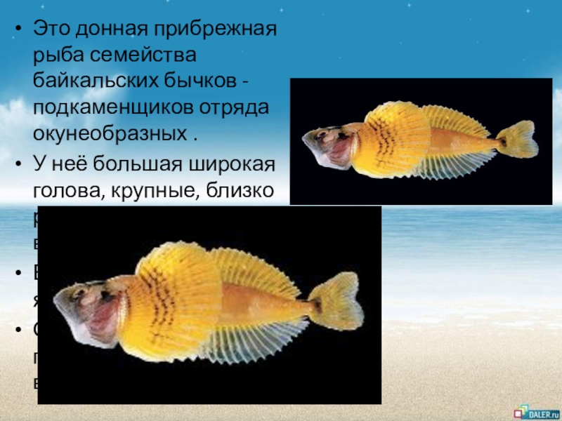 Слайд 11Это донная прибрежная рыба семейства байкальских бычков - подкаменщиков отряда окунеобразных