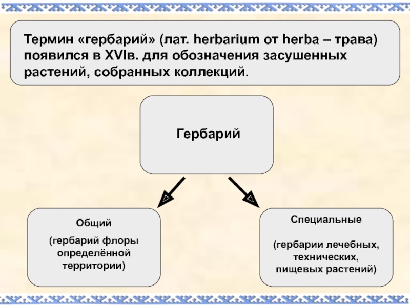 herbarium от herba – трава) появился в XVIв. для обозначения засушенных растений, собранных коллекций.