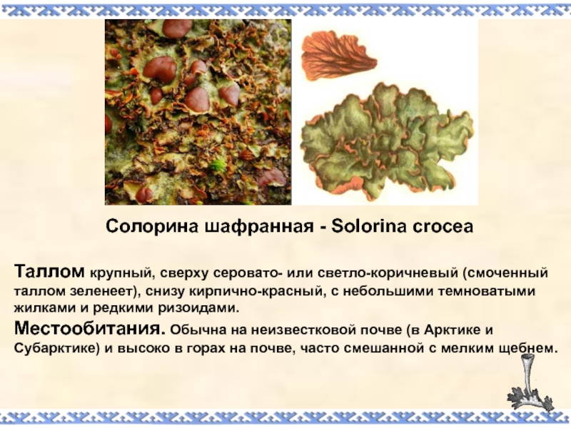 (смоченный таллом зеленеет), снизу кирпично-красный, с небольшими темноватыми жилками и редкими ризоидами.