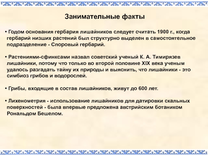 Растениями-сфинксами назвал советский ученый К. А. Тимирязев лишайники, потому что только во второй половине XIX века ученым удалось разгадать тайну их природы и выяснить, что лишайники - это симбиоз грибов и водорослей.
