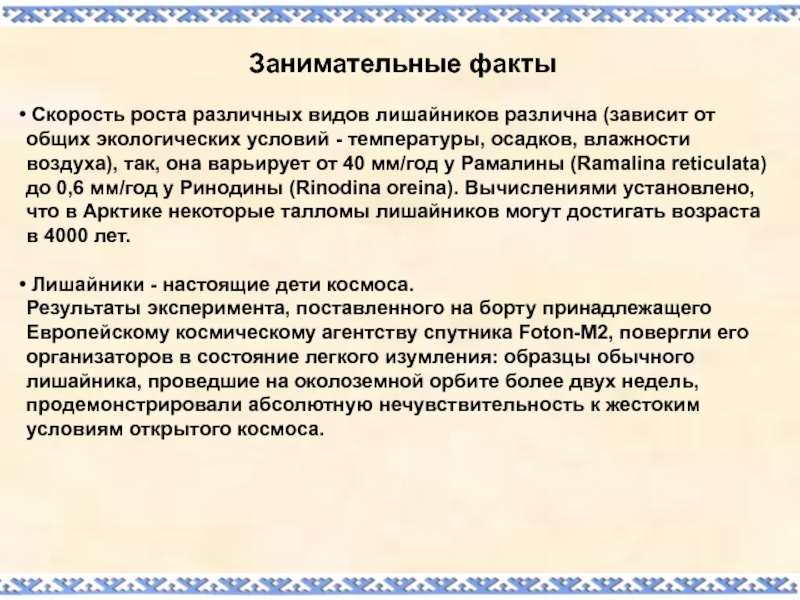 экологических условий - температуры, осадков, влажности воздуха), так, она варьирует от 40 мм/год у Рамалины (Ramalina reticulata) до 0,6 мм/год у Ринодины (Rinodina oreina). Вычислениями установлено, что в Арктике некоторые талломы лишайников могут достигать возраста в 4000 лет.