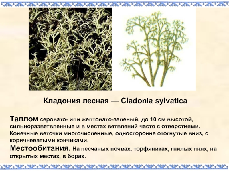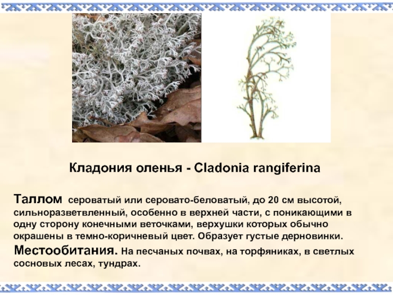 см высотой, сильноразветвленный, особенно в верхней части, с поникающими в одну сторону конечными веточками, верхушки которых обычно окрашены в темно-коричневый цвет. Образует густые дерновинки. Местообитания. На песчаных почвах, на торфяниках, в светлых сосновых лесах, тундрах.