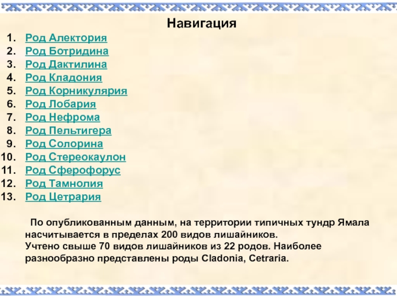 По опубликованным данным, на территории типичных тундр Ямала насчитывается в пределах 200 видов лишайников.