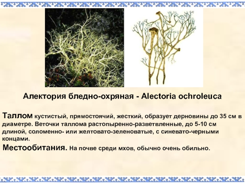 или зеленовато-коричневых кустиков, состоящих из плоских, желобчато-завернутых или почти трубчатых лопастей до 10 см высотой и 0,5-4 см шириной. Внизу лопасти красноватые или с отдельными красными пятнами. Края лопастей обычно с ресничками, иногда на вершинах лопастей они отсутствуют. Местообитания. Растет на почве в сосновых лесах, на болотах среди мхов, в тундре и лесотундре (цетрариевые тундры). Встречается как целыми дерновинами, так и отдельными экземплярами среди других лишайников и мхов.