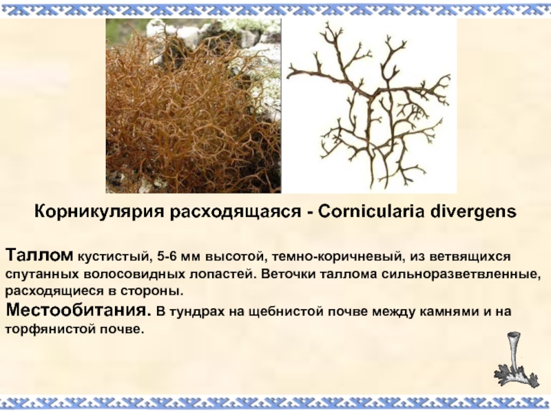 из ветвящихся спутанных волосовидных лопастей. Веточки таллома сильноразветвленные, расходящиеся в стороны.
