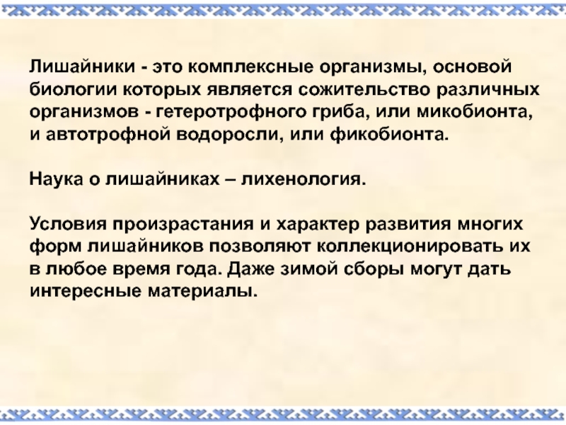 Слайд 5Лишайники - это комплексные организмы, основой биологии которых является сожительство различных