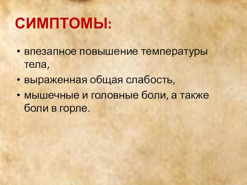 СИМПТОМЫ:впезапное повышение температуры тела,выраженная общая слабость,мышечные и головные боли, а также боли в горле.