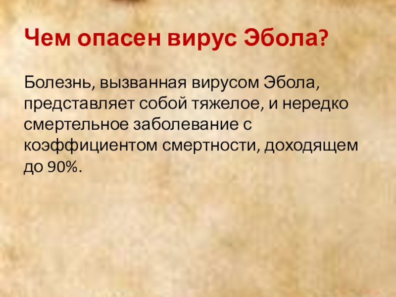 Чем опасен вирус Эбола?Болезнь, вызванная вирусом Эбола, представляет собой тяжелое, и нередко смертельное заболевание с коэффициентом смертности,