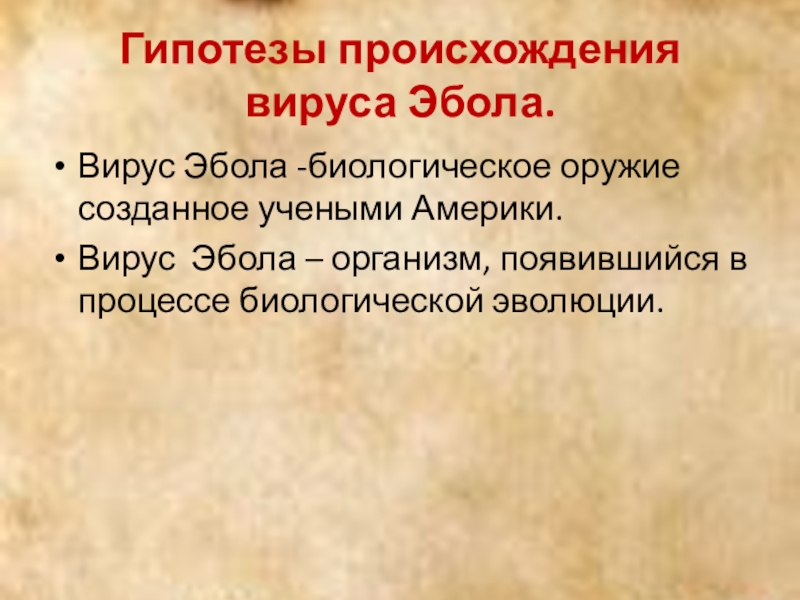 Слайд 7Гипотезы происхождения вируса Эбола.