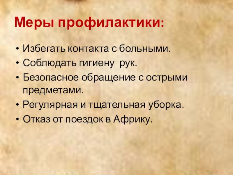 Меры профилактики:Избегать контакта с больными.Соблюдать гигиену рук.Безопасное обращение с острыми предметами.Регулярная и тщательная уборка.Отказ от поездок в