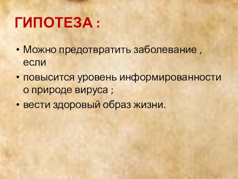 ГИПОТЕЗА :Можно предотвратить заболевание ,еслиповысится уровень информированности о природе вируса ;вести здоровый образ жизни.