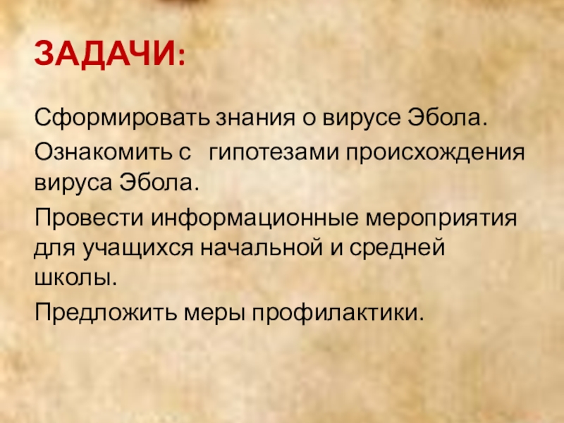 ЗАДАЧИ:Сформировать знания о вирусе Эбола.Ознакомить с  гипотезами происхождения вируса Эбола.Провести информационные мероприятия для учащихся начальной и