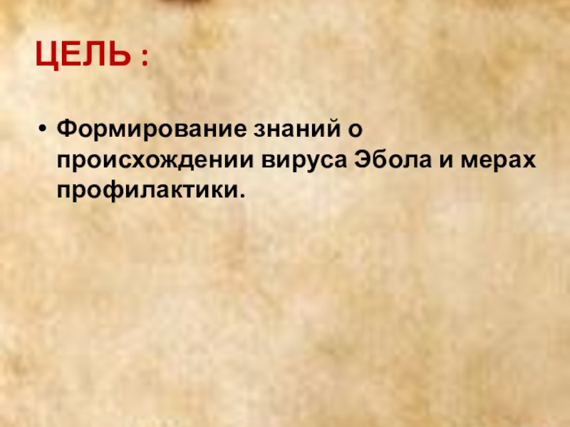 ЦЕЛЬ :Формирование знаний о происхождении вируса Эбола и мерах профилактики.