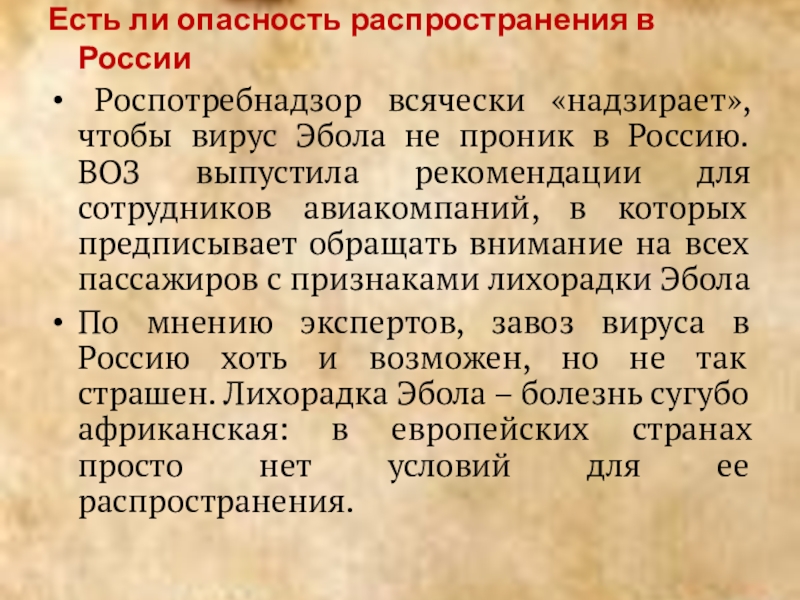 Есть ли опасность распространения в России  Роспотребнадзор всячески «надзирает», чтобы вирус Эбола не проник в Россию.