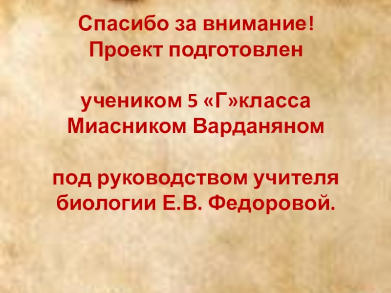 Спасибо за внимание! Проект подготовлен   учеником 5 «Г»класса  Миасником Варданяном  под руководством учителя