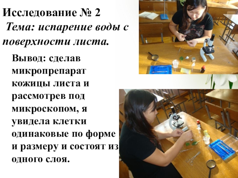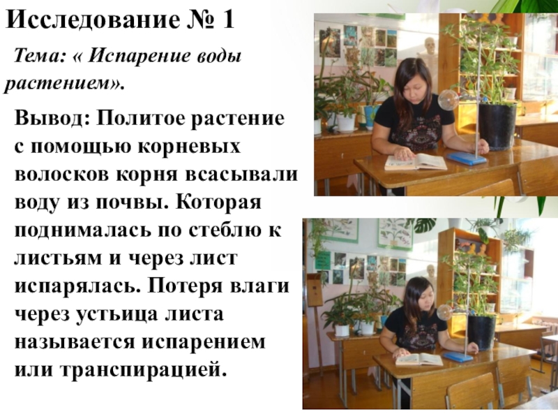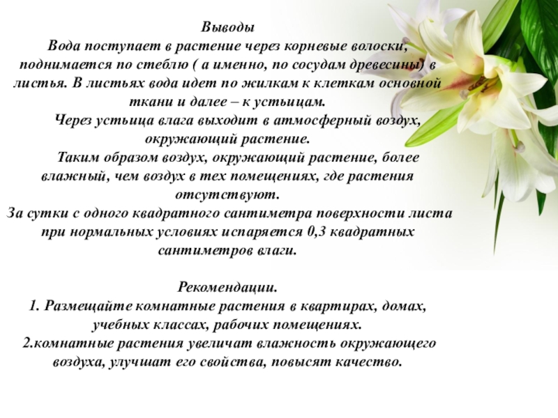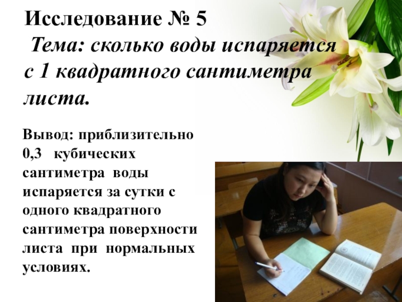 Вывод: приблизительно 0,3 кубических сантиметра воды испаряется за сутки с одного квадратного сантиметра поверхности листа при нормальных условиях.